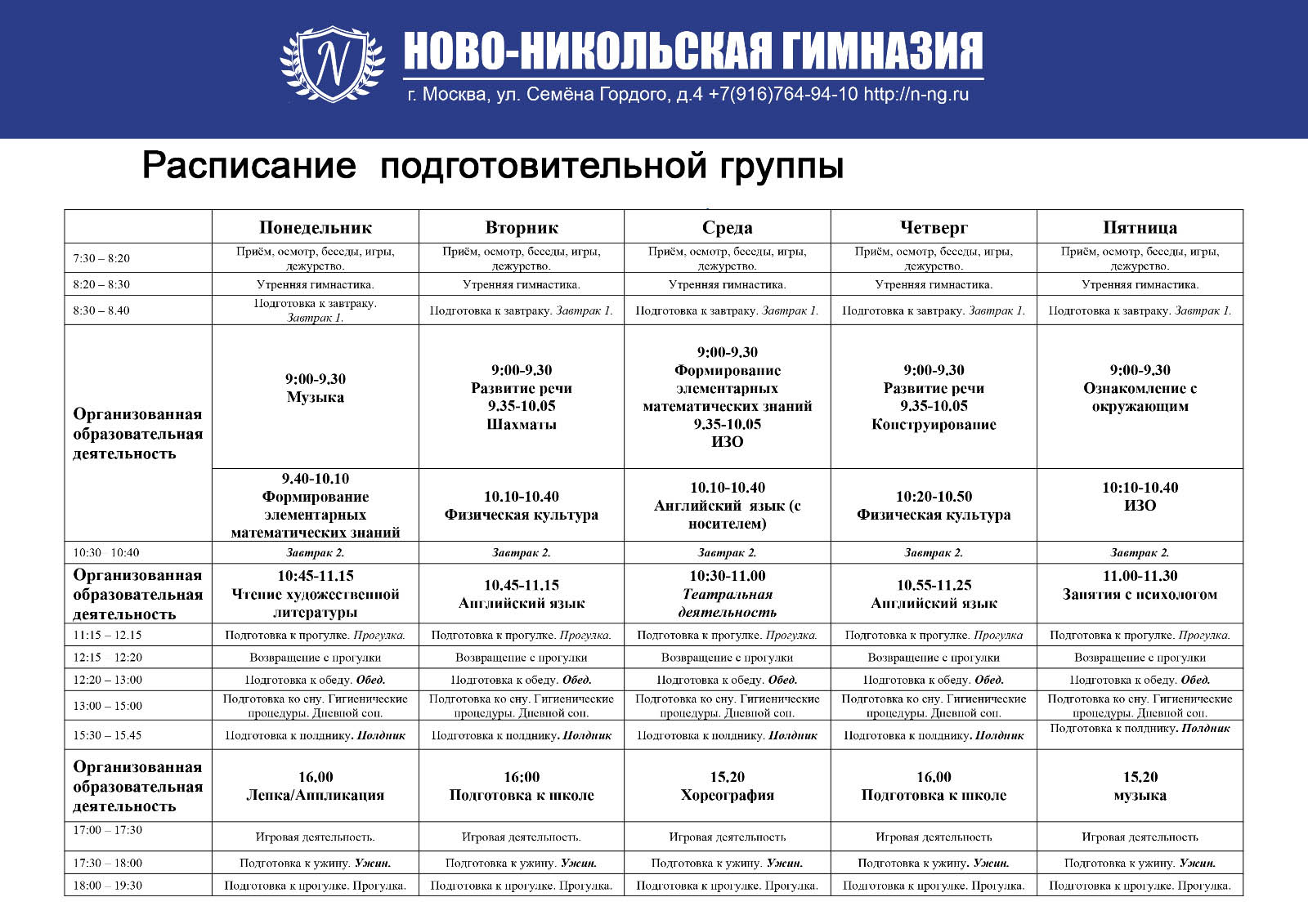 Расписание подготовительной группы